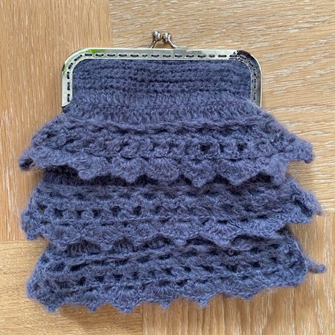 Myydään hieno,hyväkuntoinen ruskeanvärinen virkattu Lisbeth Dahlin pussukka+2kpl virkattuja rintaneuloja yht.8€