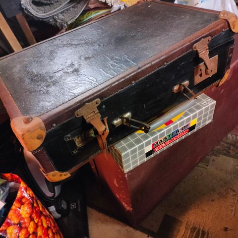 Vanha matkalaukku. On patinaa ja kulumaa. Ei avainta lukkoon.