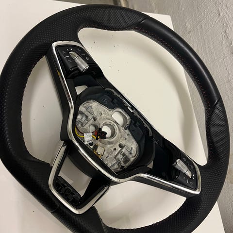 Skoda Monikäyttöinen Ratti, valmistettu mustasta nahasta. Ratti sisältää useita ohjauspainikkeita ja rullasäätimiä, jotka tukevat erilaisia ajoneuvon toimintoja. Sopii Skoda-malleihin, joissa käytetään vastaavanlaista rattirakennetta.