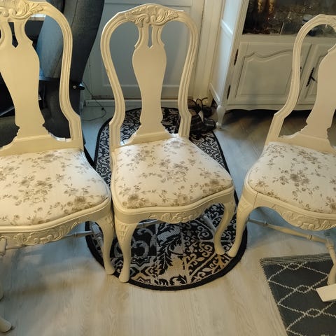 Myynnissä kerrassaan upeat kustavilaistyyliset ruokapöydän tuolit, joita on yhteensä kuusi kappaletta. Tuolit on entisöity ja verhoiltu nykyiseen loistoonsa yhden maamme parhaimman entisöijän toimesta, joten niiden kunto erinomainen, vaikka ikää niillä on jo yli 100 vuotta. Tuolien yksityiskohdat ovat upeat ja kaksi tuoleista on koristeltu kultauksin. Tuoleissa on upea verhoilu ja pehmuketta on laitettu sillä tavoin, että niissä on todella mukava istua pitempiäkin aikoja. Pinnoissa erittäin upea patina, joten todella hieno ja harvinainen kokonaisuus olisi nyt tarjolla.