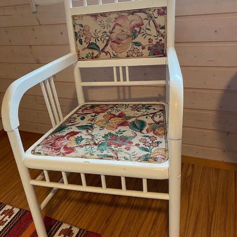 Tuoli valkoisella puurunkoisella ja kukkakuvioidulla verhoilulla