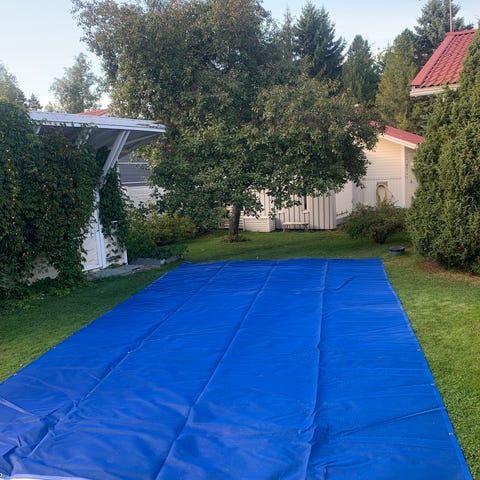 Mitat 6,50 x 4,00 m. Muotoon leikattu (5 cm peite tulee yli altaan reunoilta.) Maksanut uutena 2046€.