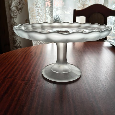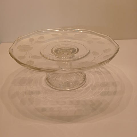 Kaunis lasinen, kukkakuvioinen kakkuvati. Korkeus 10cm ja n. 27cm kakulle. Lähetän nopeasti ja pakkaan hyvin, tulee takuulla ehjänä perille.