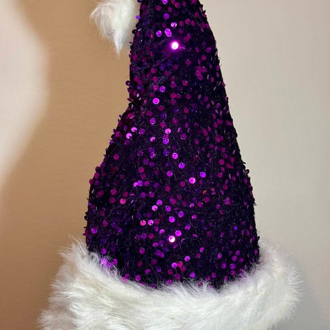 Hyväkuntoinen punainen tonttulakki jossa on valkoinen reunus ,kaksi valkoista lettiä sivuissa ja pieniä kulkuisia.