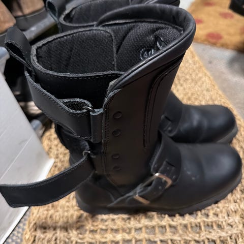 Myydään kuvan mukaiset ajosaappaat,kaksi kertaa ollut jalassa,ovat tukevat ja paksua nahkaa,pieni koirani ei tykkää mopoilustani eli maisteli saappaan reunaa ja edestä vähän pintaa,ei sinänsä haittaa ,mutta pitää mainita,voi tulla sovittamaan,muitakin mopo tarvikkeita on myynnissä,saappaista hintapyyntö 40€/tarjoa,koko n.38-39 ,vain nouto ja käteinen
