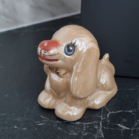 Tämä on painava patsasmainen koirakoriste. Onkohan jotain kiveä. 🤔