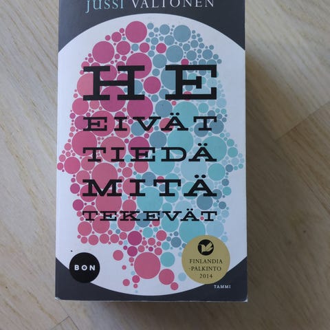 He eivät tiedä mitä tekevät, Jussi Valtonen. Tammi, 2014, 559 sivua. Kovakantinen, kansipaperit, hyväkuntoinen, takakannessa jäänteitä kaupan tarrasta. Finlandia-palkinto 2014. Nouto Helsingistä, postitus tai kysy ToriDiiliä.