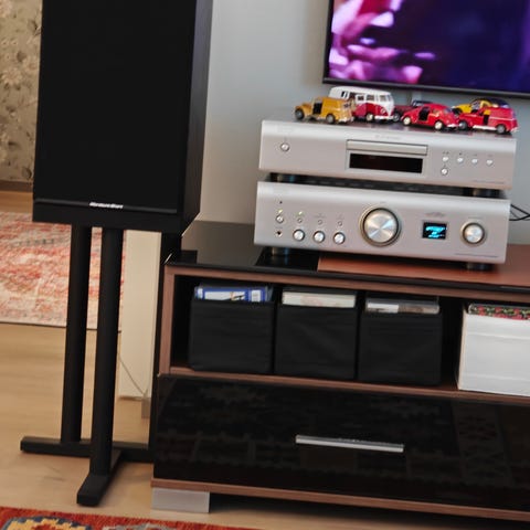 Viilupintana hieman harvinaisempi Tiger Ebony. Kaiuttimien kanssa voi ostaa myös kuvissa näkyvät open frame jalustat hintaan 200€ (ovh. 599€).