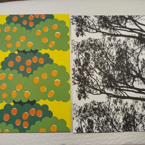 Neljä erilaista taitekorttia ja kuoret. Koko n. 14,3 x 14,3 cm.
