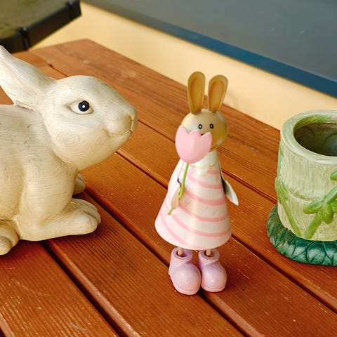 Noita-aiheinen pääsiäiskoriste, jossa on nukke ja luuta. Nukella on pitkä hame, ruudullinen helma sekä neulemainen violetti yläosa. Päällä on tumma noitahattu ja kädessä olkiluuta. Sopii pääsiäiskoristeeksi esimerkiksi pöydälle, hyllylle tai asetelmaan. Korkeus 20 cm, luudan pituus 15 cm.