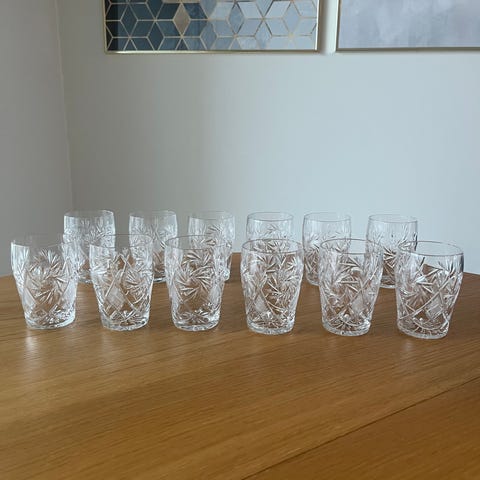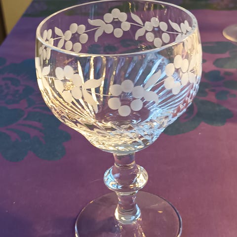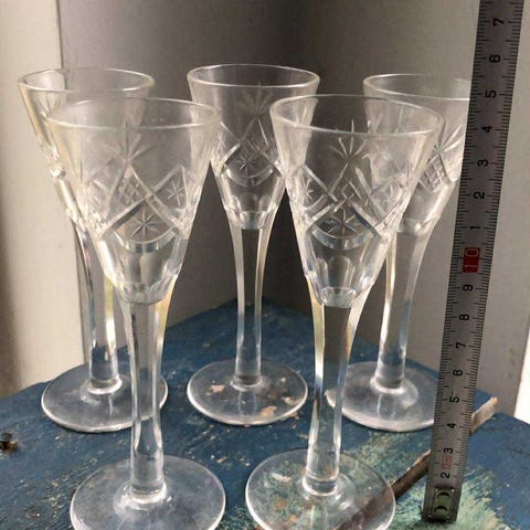 Vintage 80-luvulla kristallilasit, upeat kuviointi näyttää ulkonevalta, mutta todellisuudessa ne ovat syvennyksiä kaunis, hillitysti hiottu, kuvionti. Tilavuus: 150 mL, korkeus: 11.5 cm Halkaisija: 6.5/5.0 cm. Erittäin siistit ja kunnossa. Ilman halkeamia.