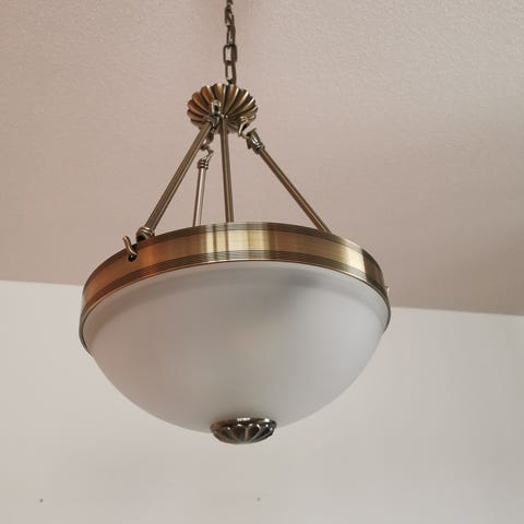 Riippuvalaisin lasikuvulla, messinkirunkoinen. Koko korkeus 115 cm, lampun koko lev, 28 kor 40 cm. Pistoke puuttuu. Ketjuilla korkeutta voi säätää. Nouto, käteismaksu.