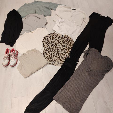 7-osainen vaatepaketti. Sisältää 5 x paita, ohut takki ja ohut, napitettava mekko.