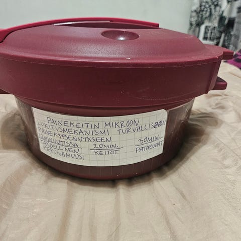 Laitteen paketti on avattu, mutta laite ei ole ollut koskaan käytössä (edes mallina). Paketissa on mukana latausjohto, kantolenkki, akkukansi (jonka läpi voi myös juoda), juomakansi ja astia, jonka voi täyttää merkkiin asti. Kannen aukosta mahtuu läpi myös Tupperwaren kestopilli (ei sis.).