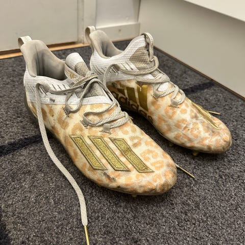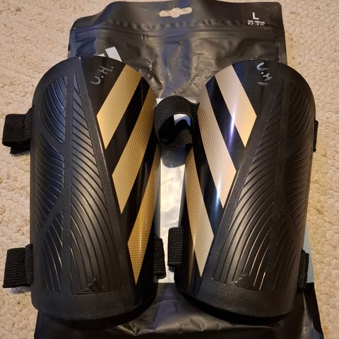 Adidaksen uutena ostetut säärystimet koko L, jalkalenksuilla ja muovi osassa käytön jälkiä.