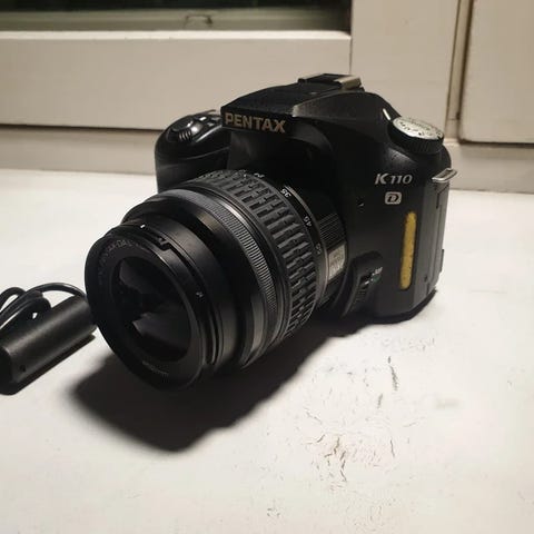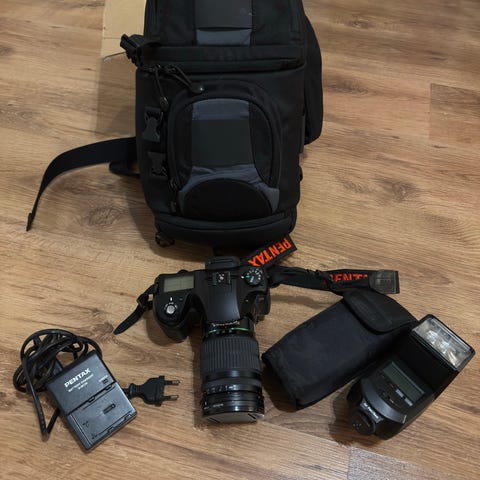 Pentax järjestelmäkamera + objektiivi + Metz salamavalo + Lowepro reppu