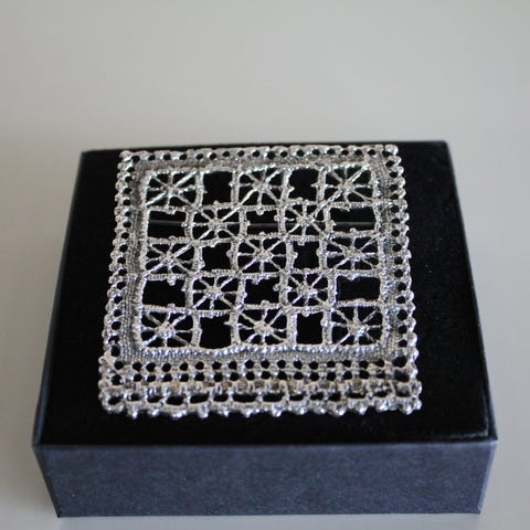 Myydään kaunis ja herkkä Pentti Sarpanevan Pitsi-rintakoru, pronssi. Koko 60 mm x 63 mm. Korun historiassa korun alaosan kulmista on leikattu palat pois ja muutama pitsisakara katkennut. Tämä huomioitu hinnassa.