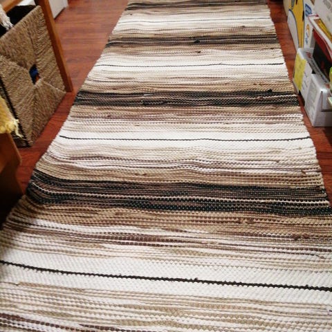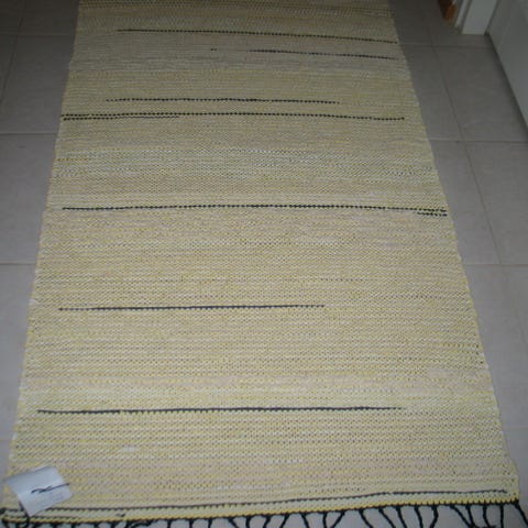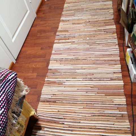 Vanha räsymatto joka kantattu ruskealla maton kanttaus nauhalla. Ompelu jälki polveilee mutta ajanee asiansa.
