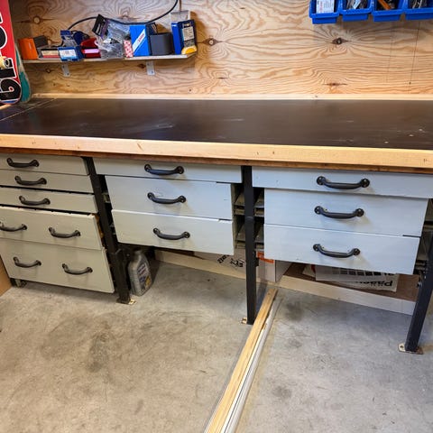 Työpöytä laatikostolla ja pyörällisellä jakkaralla puunvärinen