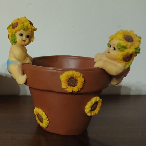 Ainoastaan koristekäytössä ollut pieni kukkaruukku, jossa kaksi kukkahattuista vauvaa koristeena. Myynnissä myös toinen vastaavanlainen ruukku eri kukilla.