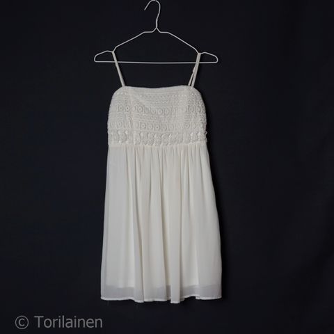 Kaunis, upeasti laskeutuva tyttömäinen ja hulmuavahelmainen lyhyt juhlamekko, jonka rintaosassa toppaukset ja kauniit laskokset. (Hengarissa otettu kuva ei tee oikeutta tälle)