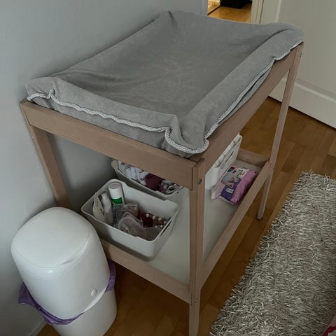 Siisti Ikean hoitopöytä hoitoalustalla ja vaihdettavalla kankaalla. Pöydässä ollut kiinni tunnistinvalo, josta jäänyt jäljet (ks. Kuva)