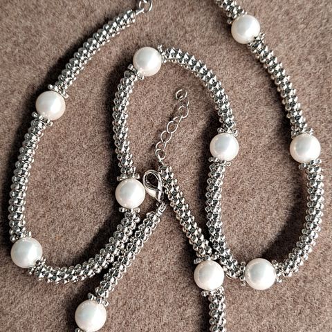 Hopeinen helmikorusetti: kaulakoru 38 cm, ranneketju 20 cm, 2 korvakorua