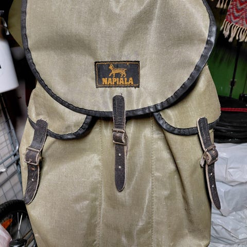Vanha,mutta hyväkuntoinen,iso selkäreppu. Olkaimet vahvaa nahkaa,pehmustettu teddyllä sisäpuolelta.