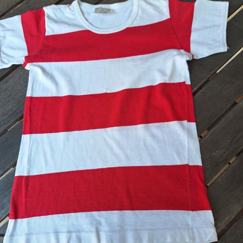Tasaraita vaaleansininen lila paita. Koko 130-140cm.