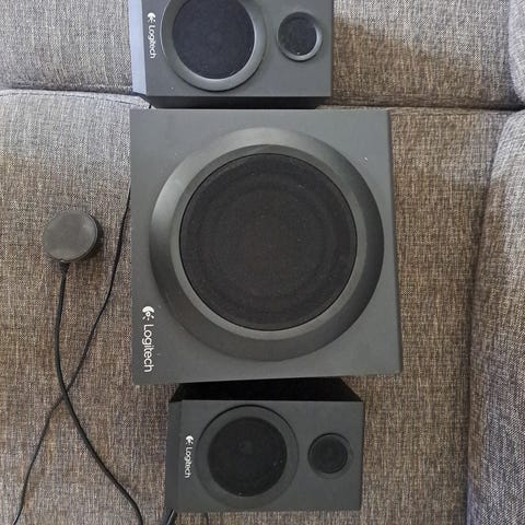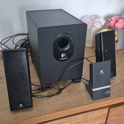 Vähän käytetyt mustat tietokoneen kaiuttimet. Myydään ylimääräisenä. Subbarin yksi jalka haljennut ja ainoastaan ruuvi jäljellä, pysyy kuitenkin pystyssä. Takaosan yksi liitäntä hapertunut, ei kuitenkaan haittaa käyttöä. Kuvattu.