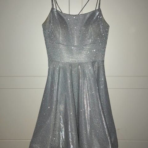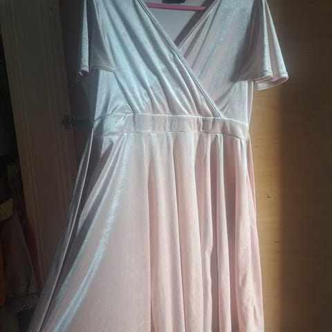 Muotikuusta ostettu kultavihreä juhlamekko. Edessä solmittava, mekossa kiinni oleva ”vyö” joka korostaa vyötäröä. Hihansuissa joustavat resorit, hihat väljät. Ilmava, silkkimäinen mekko. Muutama langanveto, niistä kuvat. Eivät haittaa käyttöä. Kerran käytetty, koko 1 joka käy monenkokoiselle. Hinta ostettaessa 329€.