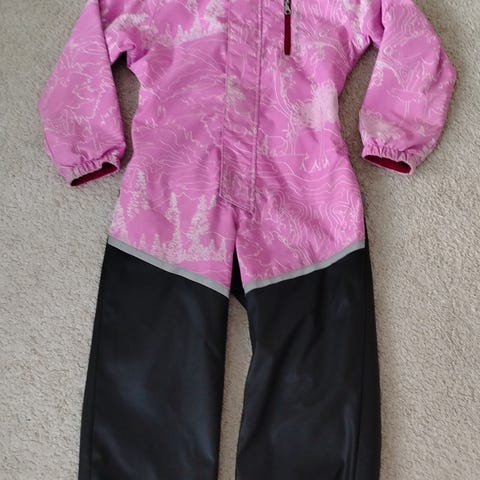 Lassie välikausihaalari 122 cm. Yleisilmeeltään siisti. Kunto hyvä/kohtalainen. Huppu hukassa. Vaaleissa osissa jonkin verran tummentumaa/tahraa (jokaista tahraa en syynää). Polvissa hieman kulumaa. Jalkalenkit ehkä vaatii vaihdon (itse kyllä käyttäisin vielä näin).