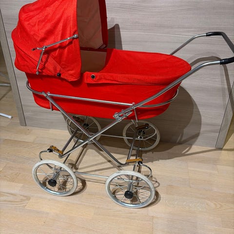 Vanhat Brio nukenvaunut. Kumipyörät, tummansiniset metalliosat sekä punainen tekstiiliverhous. Mukaan itse tehdyt patja ja vuodevaatteet. Kupu taittuu moitteetta. Jalkajarru alamäkiävarten. Tukevat käytössä. Korkeus ja pituus noin 70 cm ja leveys 35 cm.