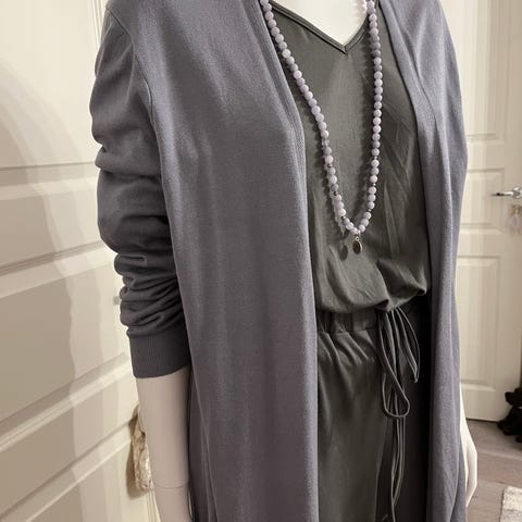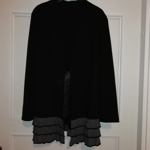 Kuvanmukainen, erikoisempi Kellon neuletakki koossa 46. Materiaali näkyy kuvassa 4. Yksi nappi irti, mutta varanappi mukana. Vaatteessa paljon hienoja yksityiskohtia, ks esim kuva 3. laput vielä kiinni, kuva 5.
