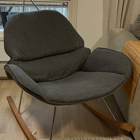 Tästä keinutuoli uuteen kotiin, vaatinee hieman puhdistamista jos aivan valkoiseksi tahtoo.