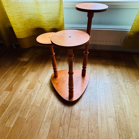 Kohtalaiset hyvä ja kiva kukkapöytä, mutta on käytetty ja jonka pinta klinkkerilaattaa, joista kaikki ehjiä, jalat metallia ja taso puuta. Reuna estää ruukkuja putoamasta ja menemästä rikki, vankka eikä nitku.