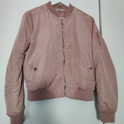Stradivariuksen musta bomber takki koossa L. Koko on melko pieni, ennemmin s/m kokoinen. Naisten takki. Ehjässä ja siistissä kunnossa. Edessä moleminpuolin pienet taskut. Ylettää lantiolle.