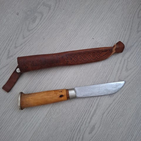 Metsän raivaukseen ja hoitoon melkoisen käteensopiva puukko. Tunturiloma OY lukee terään kaiverrettuna, lienee valmistaja (ostettu Sokokselta aikoinaan). Käytetty ja toimivaksi todettu rajalinjojen raivaukseen. Voin postittaa mutta en toridiilillä.