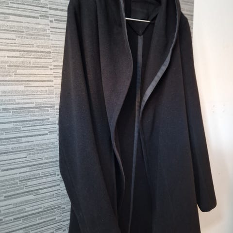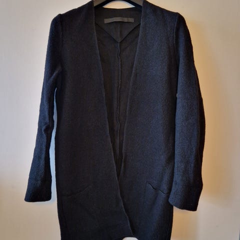 Musta. Koko xs, pit. 90cm, hartiat 42cm, k-k 58cm, hiha 59cm. Pari kertaa käytetty. Taskut sivuilla, lisäksi sisäpuolella kaksi taskua. Kierrätysvillaa ja polyamidia, kokonaan vuoritettu. Molemmista päistä avattava vetoketju. Nomen Nescio on suomalainen firma.