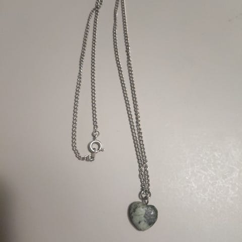 Vihreä kivisydän kaulakoru pitkällä hihnalla. Voin lähettää.