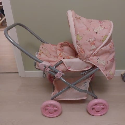 Nukenrattaat leikkeihin! Nuken kantokoppa erikseen, rattaat toimivat siis sekä kantokopan kanssa nukkuma-asennossa, ja ilman koppaa istuma-asennossa. Kantokopan toinen hihna irronnut, sen pystyy korjaamaan. Muuten rattaat hyvässä kunnossa. Menevät kasaan.