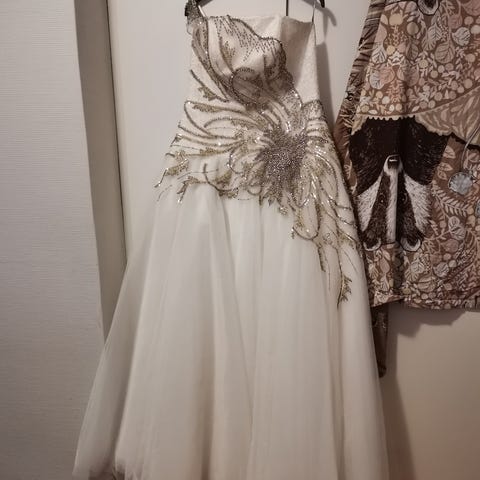 Hääpuku, sopii noin 42 kokoa käyttävälle. Mekkoa on pienennetty ja mahdollisuus purkaa suuremmaksi. Pituus noin 170cm pitkälle ja itsellä 5cm korot. Mekossa kupit E kokoiselle, kupit mahdollista poistaa tai vaihtaa halutessaan.