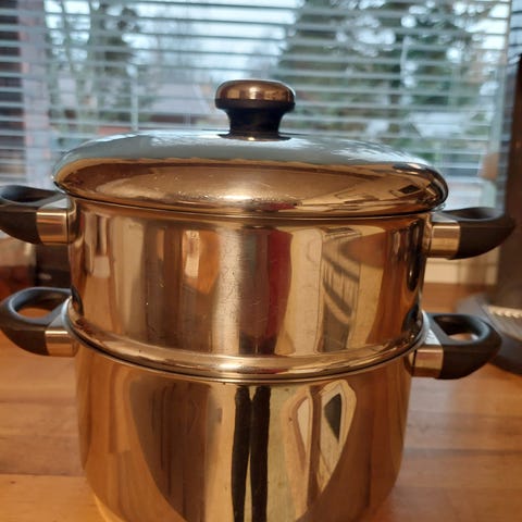 Kolmikerroksinen kerroskattila. Käytetty mutta siisti. 3l. Ei sovi induktioliedelle. Nouto tai postikulut ostajalle.