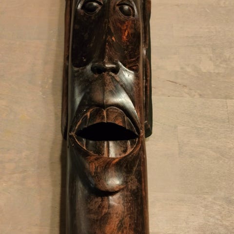 Musta puunaamio, korkeus 48cm ja levein kohta 12cm. Ripustuslenkki takana.