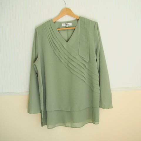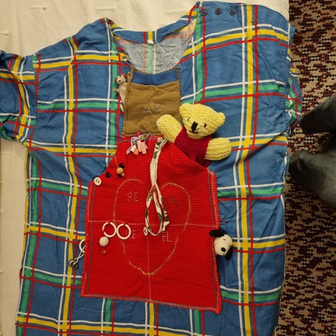 Juhlapusero, materiaali ohutta silkkiä (?) koristeena samettia, mustia kiiltäviä pisteitä. Vyötäröllä päällystetyt napit. Vyötärön mitta noin 108 cm, ja yläpuolelle muodostuu suuri ”pussi”, jolla peitetty suurta vatsaa, käytetty äitiysaikana.