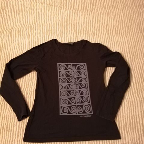 Musta- oranssi raidallinen Marimekko t- paita pitkillä hihoilla. Made in Finland. Koko lappu paidassa L -on pikemminkin reilu S tai M, alaspäin levenevä. Laaja pääntie. Hyvä kunto.