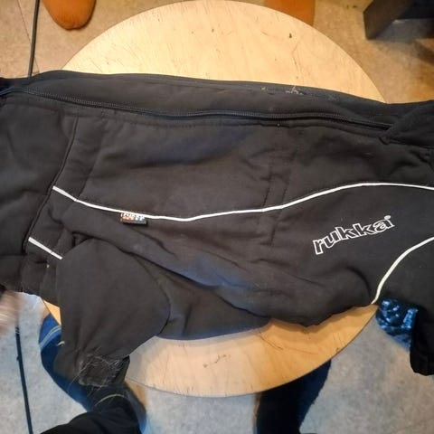 Kuvien mukainen erittäin muhkea ja lämmin takki pienelle koiralle nappikiinnityksellä. Selkämitta noin 27 cm. Jalkalenksut takana. Istuvuutta voi säätää takissa kiinni olevilla valjailla. Mukana myös huppu, jonka saa halutessaan kiinnitettyä napin avulla niskaan. Reikä selkäpuolella talutinta varten. Tassunsuissa ja takana joustavat resorit. Noin mittoja löytyy kuvista.