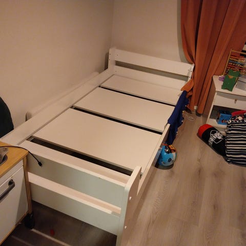 Myydään yhdellä lapsella käytössä ollut Unipuun 90 x 200 sänky sälepohjalla (patjat eivät kuulu kauppaan, mutta voin myydä erikseen). Sänky on kunnoltaan todella siisti, ei tarroja, hampaanjälkiä tai muitakaan kulumia. Ainoa moite on pohjan kannattimen reikien kuluminen sängyn toisella laidalla. Reikiä voi tiivistää esim. puukitillä ja fiksata näin tukevammiksi. Tai halutessaan kootessa käyttää liimaa. Lisäkuvissa kuvia näistä ruuvirei'istä.