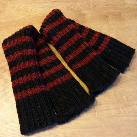Kahdet kirsikanpunaiset säärystimet. Vasemmalla pitemmät 5e ja oikealla 4e. Molemmat ostaessasi 8e yhteensä.