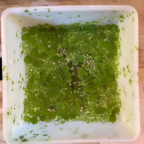 Muutama kappale akvaarion pintakasvia. Ehkä salvinia (kellusaniainen).